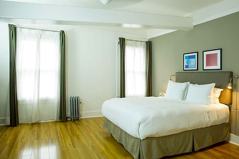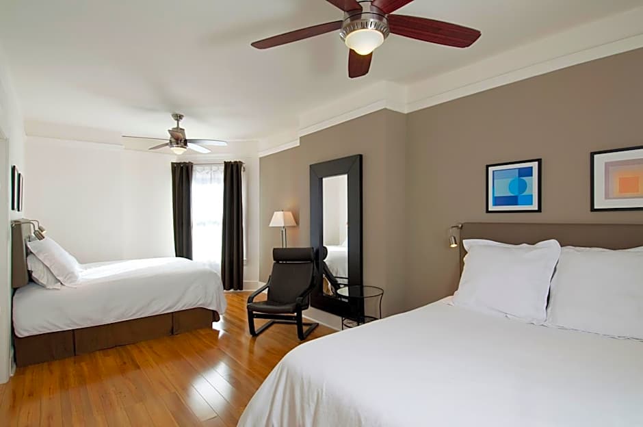 Featuring a seating area with chairs, this spacious suite is styled in wood flooring, modern decor and colorful accents. A flat-screen cable TV is offered.